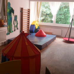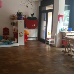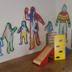 Oben liegen unsere Aufenthaltsräume. In unserem Gruppenraum kann gemalt, gebastelt, geknetet, gespielt, gekuschelt und gelesen werden. Außerdem werden hier an zwei großzügigen Tischen die Mahlzeiten eingenommen. Im Bewegungsraum gibt es viel Platz zum Toben, eine große Matratze, eine Sprossenwand, eine Rutsche, eine Schaukel… Darüber hinaus haben wir einen gesonderten Schlafraum sowie ein Kinderbadezimmer.