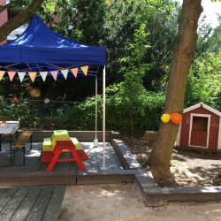 Unser großzügiges Außengelände umfasst einen Hof, Rasenflächen, zwei große Sandkästen, eine kleine Rutsche, drei Schaukeln, einen Kräuter- und einen Naschgarten.